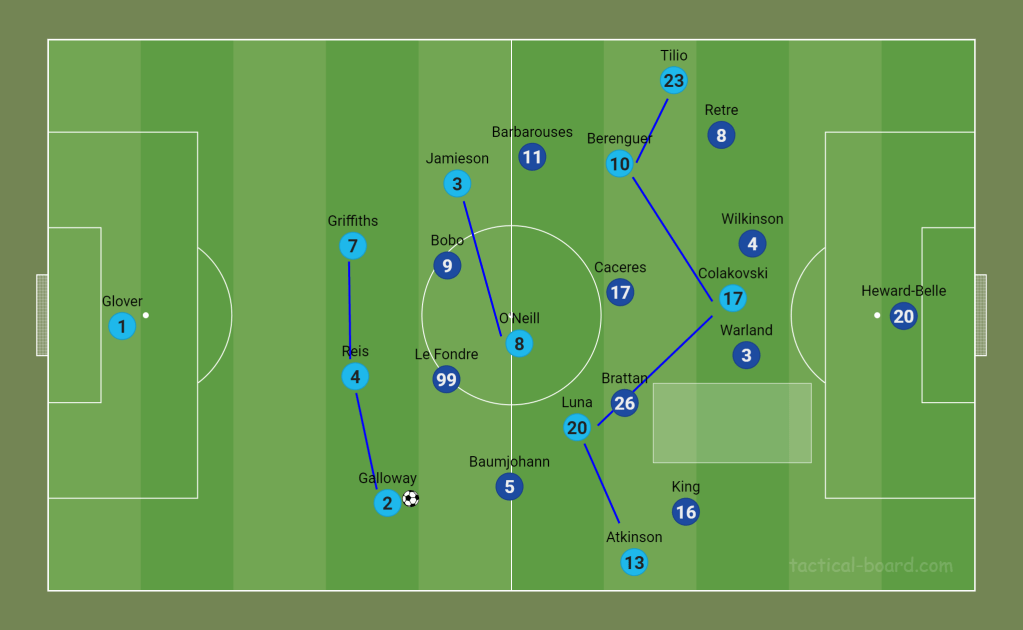 Thus, City’s build-up play shape switched to a 3-2-5 where in Jamieson also started playing more centrally. Then Atkinson started to operate more centrally to exploit that space between Warland and King which allowed more space for Galloway on the right flank to overlap and create a 2 v 1 against King as Baumjohann could not keep up with Galloway’s movement and speed.