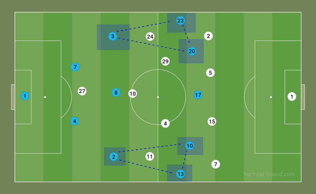 As you can see in the below picture, City created triangles in the wide areas which involved a full-back, winger and attacking midfielder, trying to open the compact defensive block of Sydney.
