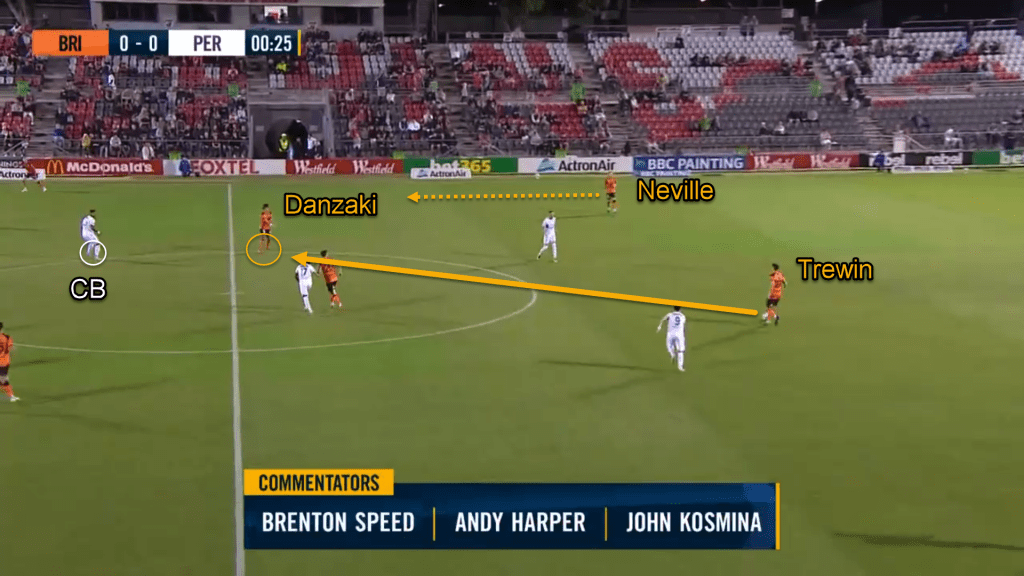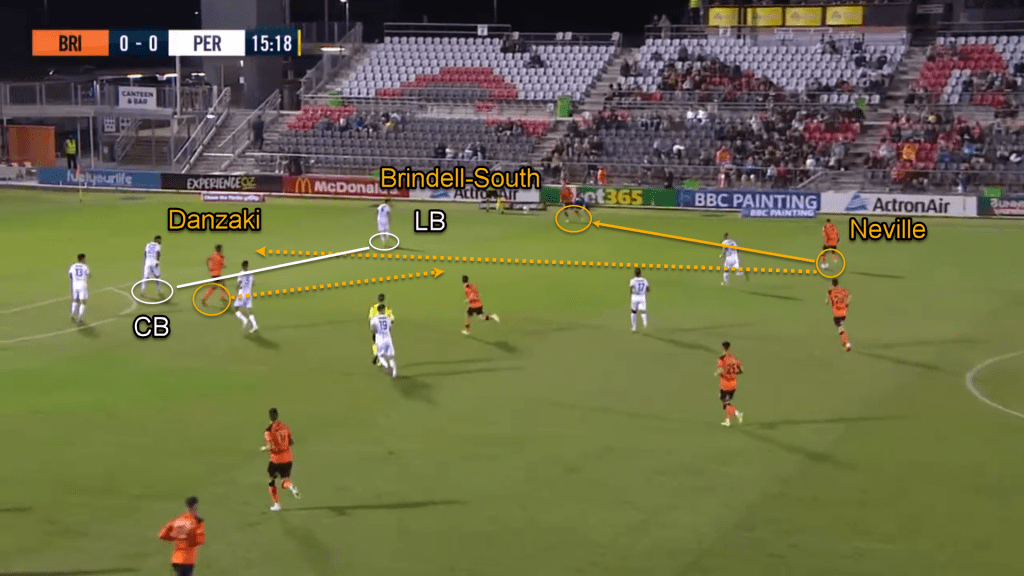 Often, Danzaki dropped in between the lines to provide a passing option to his defenders. Due to Perth man-marking the Brisbane midfielders, the CB was dragged by Danzaki till the halfway line like in the above picture and some other player would take Danzaki’s place. In this way, to disorganise the opposition, Brisbane’s midfielders kept on rotating.