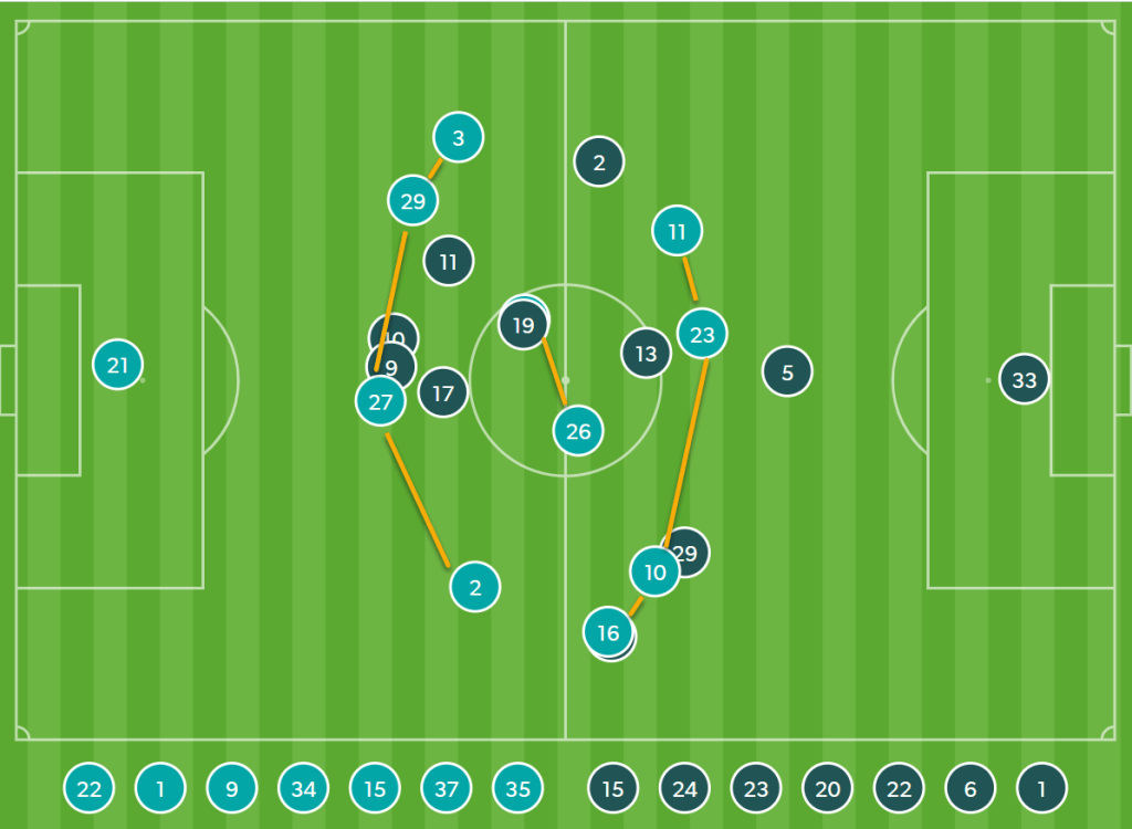 Along with these players, one of the central midfielders, usually O’Shea, would push up to join the attack while Akbari would stay back to guard the defenders. In this match, it proved to be an extremely effective way for them to create chances and score goals.