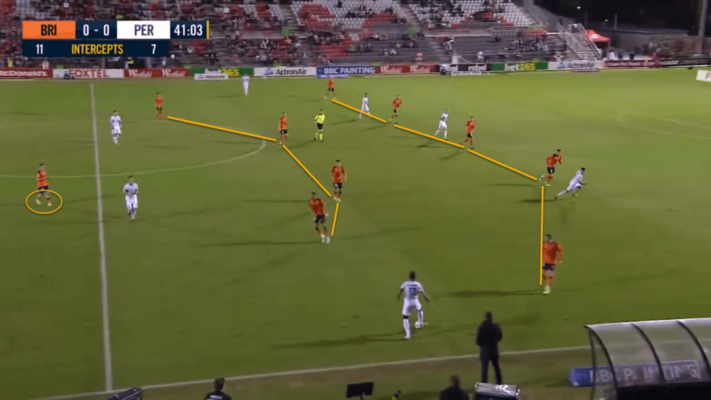 The Roar are known for their structured and intense pressing. Against Perth, they set up in a mid-block 5-2-2-1 structure in which Wenzel-Halls led the press. Perth kept 60% of the possession trying to find a way through the Brisbane’s defence. Now, let’s have a look at the Roar’s pressing.