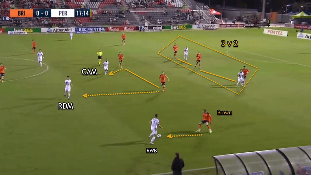 As you can see in the above picture, the ball now went out to the RWB. Brown comes out to press him and the midfielders would shift across to mark the RDM and CAM. While at the back, Brisbane kept a numerical superiority of +1 and would also shuffle across to close the gaps behind Brown.